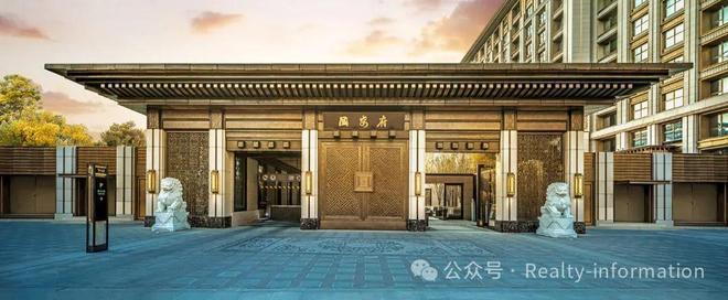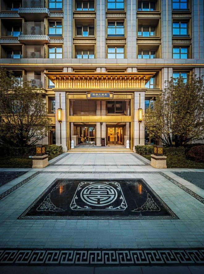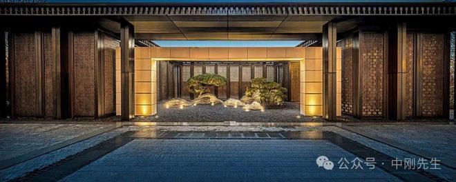 中西琢著:经典三段式建筑设计,沿袭中式对称造筑手法,仿铜金属、典雅石材精琢立面,矗立园中犹如石中藏金